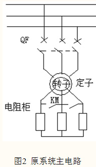 原系统是采用绕线电机串电阻降压启动,然后全压运行的方式进行控制的,如图2示。